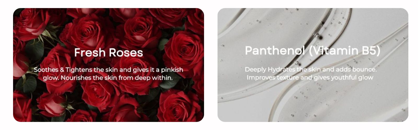 Rose Face Gel: Aqua, Rose Hydrosol, Glycerin, Isopropyl myristate, Sunflower oil, 1,3-propanediol, Hyaluronic, Aloe vera, D-panthenol, Emulsifier, Almond oil, Grapeseed oil, Niacinamide, Strawberry Extract, Oat Protein, Vitamin E, Benzyl alcohol, salicylic acid, glycerin, sorbic Acid, Polyquaternium